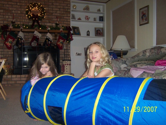 We had lots of fun with Max and Hailey when we watched them. Kenzie helped Hailey to play the puter (computer)which she enjoyed doing. Max and Hailey were so excited when Kenzie brought the tunnel down for them to play with. It kept them busy for quite some time and brought many smiles. Max went right through it without any hesitation. Usually kids have to get used to it and we have to talk them into going through. Max couldn't get through fast enough though. Max was also fasinated with the snow globe. He loved looking at the snow and pushing the button so music would play. Jacob loved it last year, and this year he was so excited when he saw it too.
