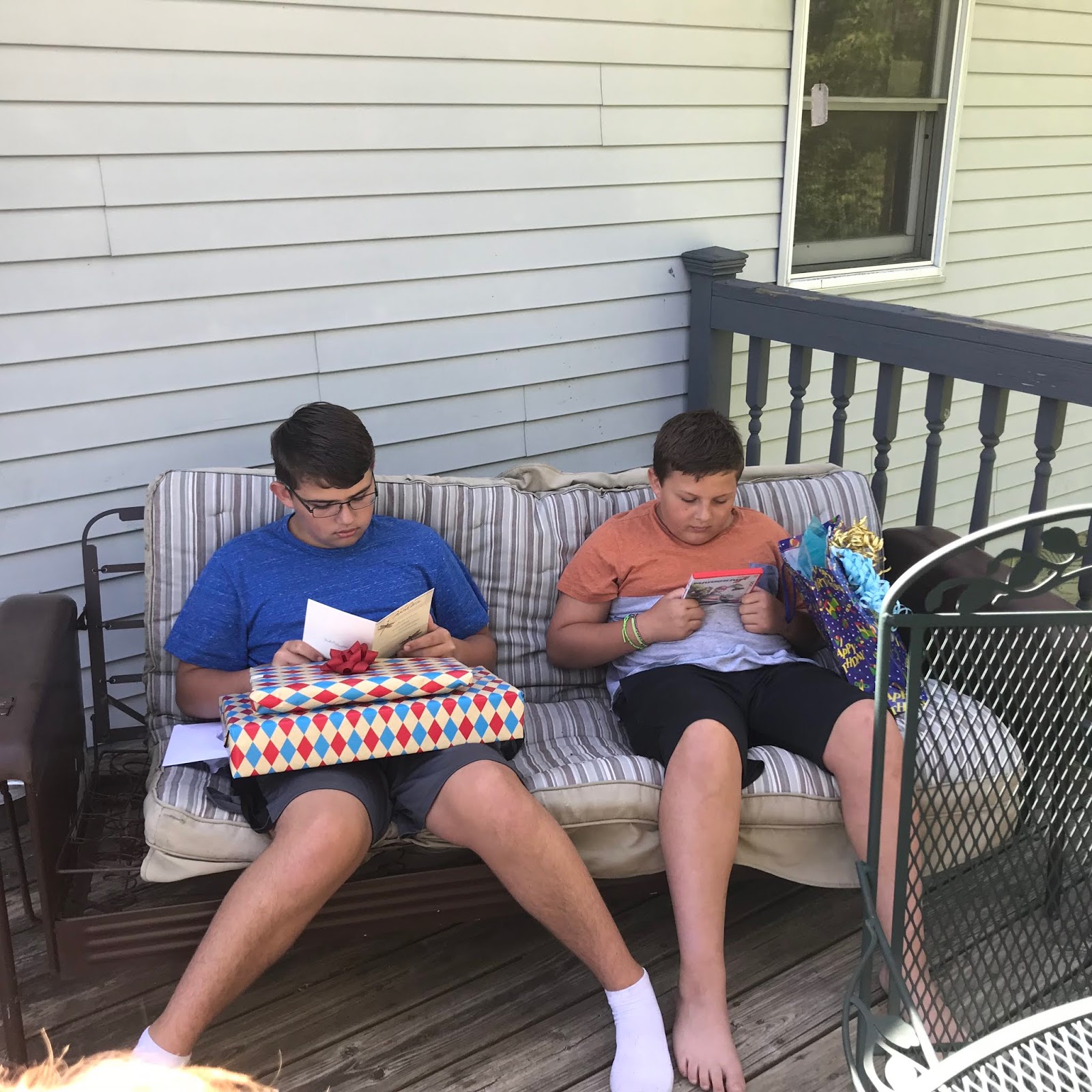 | Jacob and Adam getting ready to open their Birthday Presents from us |