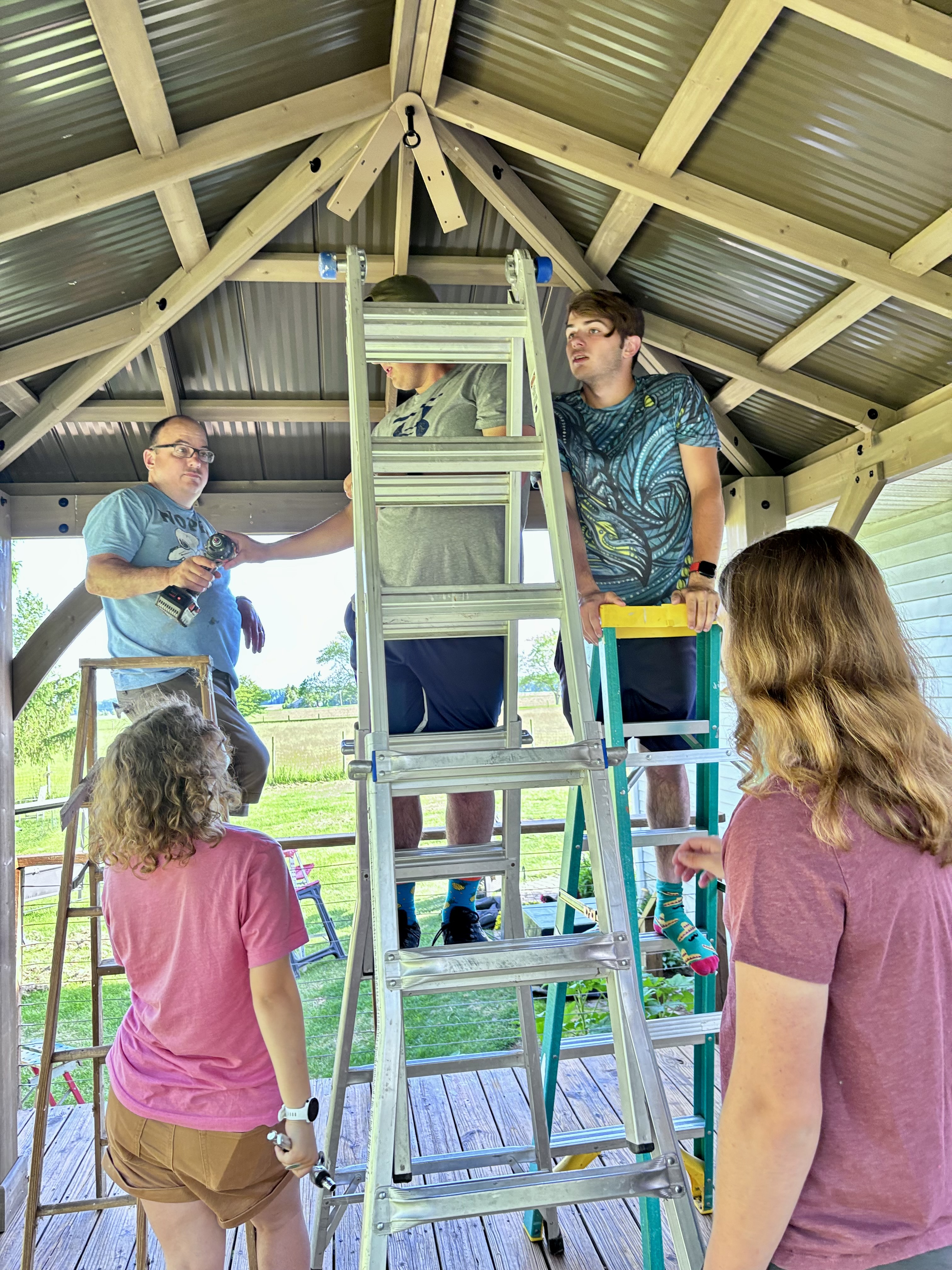 Bill woke up at 6:30 and went to the bathroom. I got up and went outside to see if I had caught the raccoon. I did so I had Bill get up and take care of it, because it was such a big one. Possums I can handle, big raccoons wiggle around too much. We went back to bed until 8:30. I sat out on the deck and watched birds and then read my Bible. Of course, Kit Kat joined me. Bill filled the pool up to where he has to hook the filter hoses up, then we can add more water and the chemicals. I caught another chipmunk in the trap. I went to drop a it off and then went to Menards to get bird feeder/birdhouse wire hangers. I’m making sure everything is hung by long wire because raccoons leave stuff hung by it alone. It worked perfectly when I got home. After that, I sanded and washed two glider chairs, then spray painted them. They look so nice. I finished in time to take a chair I brought back to Aldi, then went to Melissas. Evan got up from the computer right away and came and gave me a big hug. It made me so happy. I went outside with him so he could show me how he does a back flip on the trampoline. Hailey followed me out and I almost shut the door on her because I didn’t know she was coming out. Jack came out too. Evan does them so easy! It was nice getting to visit with the kids before Hailey, Melissa and I went on our 2 1/4 mile fast pace walk through their subdivision. I got to see Max and Bruce when I went back in the house! Yay! We girls walked, with Hailey walking a little faster and then walking back to us and the going ahead again. Melissa and I have the same pace so we enjoyed visiting as we walked. We saw some beautiful houses and landscaping, and on one street beautiful small sheds. We had fun even though it was lots of exercise. I had to leave when we got back to Melissas so gave hugs and headed home. Bill and I went to pick up pizza for the Russells and a sub for fussy Bill. Bill had loaded all of our ladders, so we headed to Kimmy and Jared’s. They had the frames for the roof mostly put together. They worked on all four sections, and got it almost done. Next step will be putting it up. We left because it was getting dark out. They sure work well and have fun together.